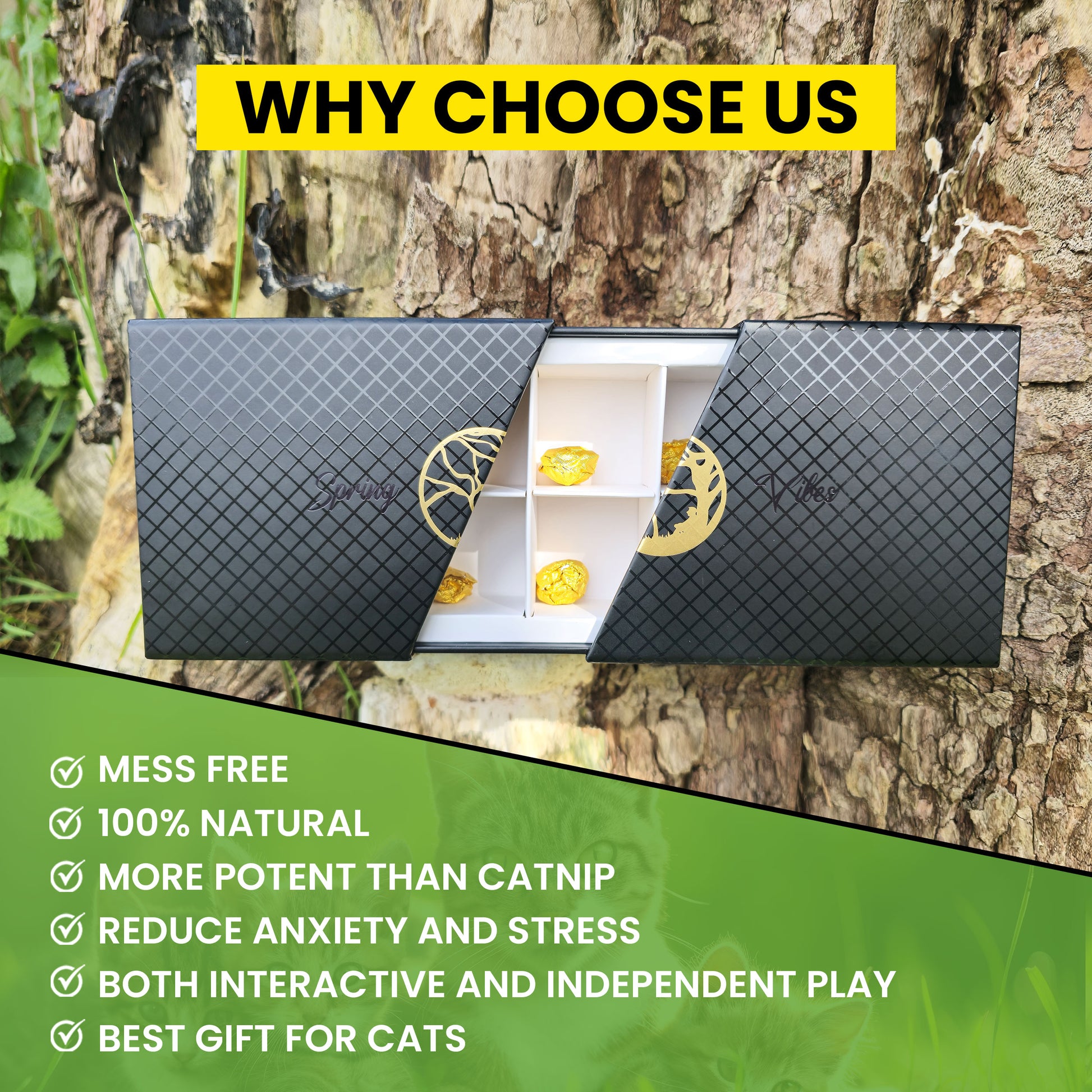 Choose a luxurious present for your furry friends or friends with furry friends that is meticulously crafted, combining two natural sources of catnip, Silve Vine (Actinidia polygama) gall fruits (a rare potent cat stimulant that captivates cats who are indifferent to traditional catnip) powder-coated and oil-infused with catnip (Nepeta cataria) for triple the natural thrill to offer the best experience of more than a catnip product. It alleviates stress and anxiety by increasing playtime. Have fun watching them relax, step back, and enjoy a gift that keeps on giving happiness to the whole family. It is 100% natural, highly potent, and sustainable.