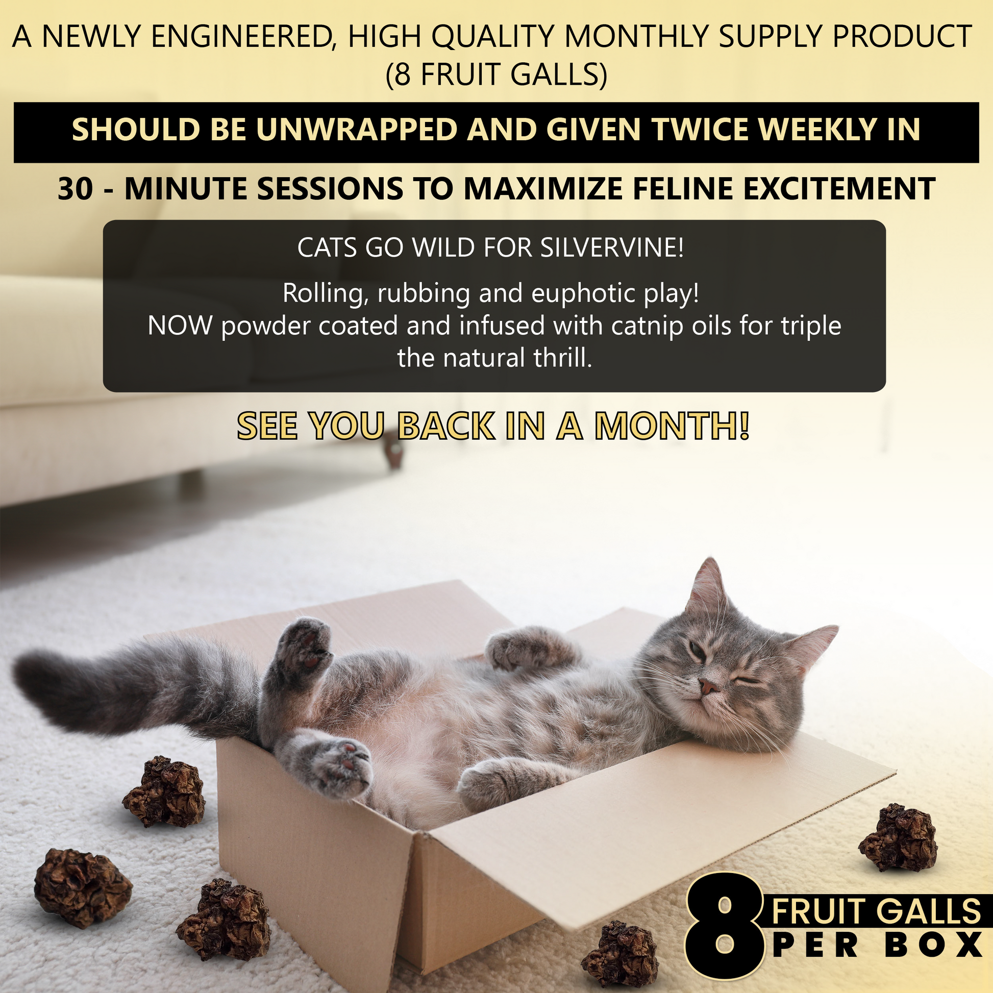 - BETTER THAN CATNIP: Our uniquely crafted product is created by merging two natural catnip sources. Silve Vine (Actinidia polygama) gall fruits (a rare potent cat stimulant that captivates cats who are indifferent to traditional catnip) powder coated and oil infused with catnip (Nepeta cataria)for triple the natural thrill.